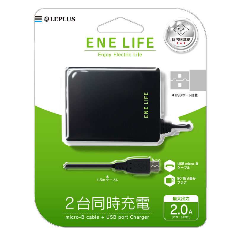 「ENE LIFE」AC充電器 2台同時充電(micro-B cable+USB port)