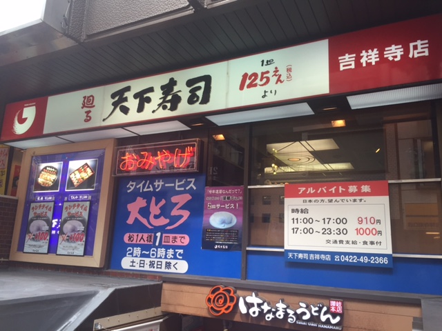 廻る天下寿司 日記 2016.09.28 こんにちは 東京支店の松並です。 最近ランチによくお寿司を食べます。 その中でも特にお気に入りなのがタイトルにあるお寿司屋さんです。 平日のランチタイムに限り125円のお寿司が100円で食べられるのでおススメです。 店内が携帯電話の使用ができないので、外観だけの写真になります。 都内中心に展開しておりますので看板を見たらぜひ立ち寄ってみてください。 ちなみに今が旬のサンマがめちゃくちゃおいしかったです