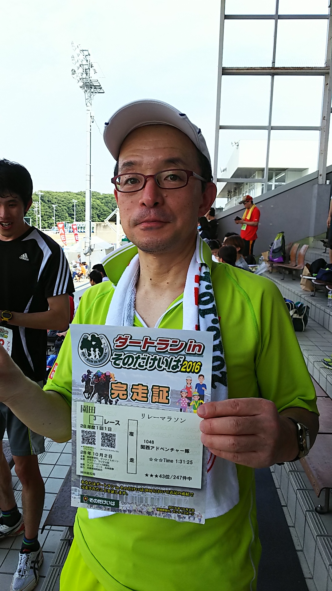 ダートラン 日記 2016.10.07 関西の園田競馬場内を走るリレーマラソンの企画が今年もあり参加してきました。 走り慣れないダートコースに加え昨日からの雨で非常に走りにくい状況の中 ハーフの距離をチームでリレーするというものでした。 247チーム中43位と昨年を上回る記録でした。 メンバーに陸上経験者が加わった事での結果かと思います。 このメンバーでまた走れる事を期待してま~す。 松浦でした。