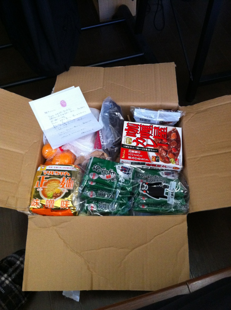 米、みかん、海苔、ごはんですよ、ふりかけ、レトルトカレー、インスタントラーメン、